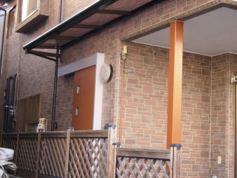 | ■外壁をサイディングにリフォーム。今まで通路が狭く 使い勝手の悪かった玄関扉を引き戸タイプに! ひさしも長めに取り付けて雨の日も安心。 駐輪所もワンポイントでタイルを敷き明るい イメージに…。 |
